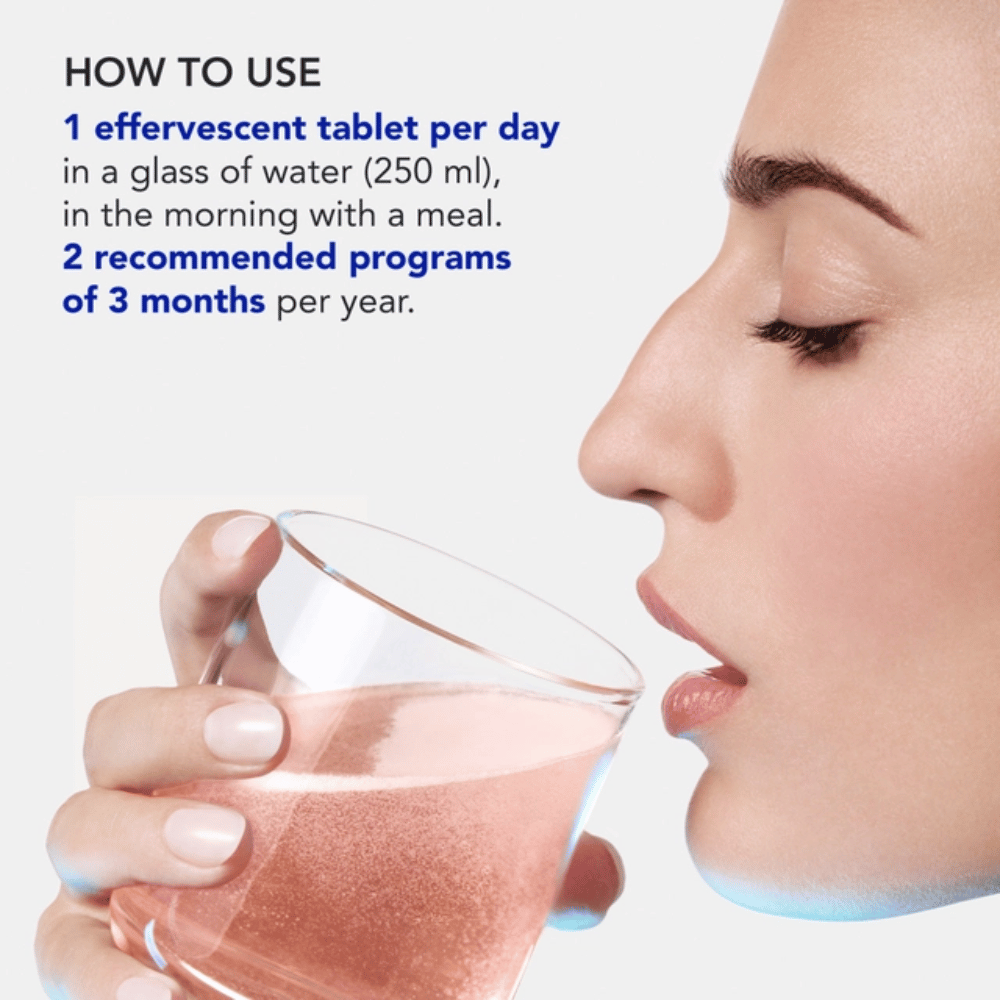 1 effervescent tablet per day, dissolved in a 250 ml glass of water, preferably in the morning with a meal. It is recommended to follow 2 three-month courses per year: one in autumn and one in spring.